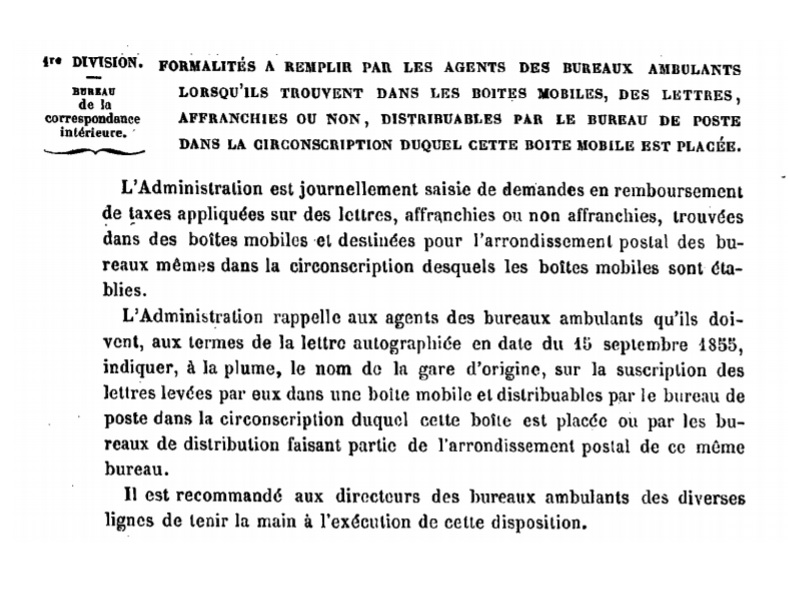"Formalité à remplir par les agents des bureaux ambulants lorsqu’ils trouvent dans les boites mobiles,des lettres, affranchies ou non, distribuables par le bureau de poste dans la circonscription duquel cette boite mobile est placée."